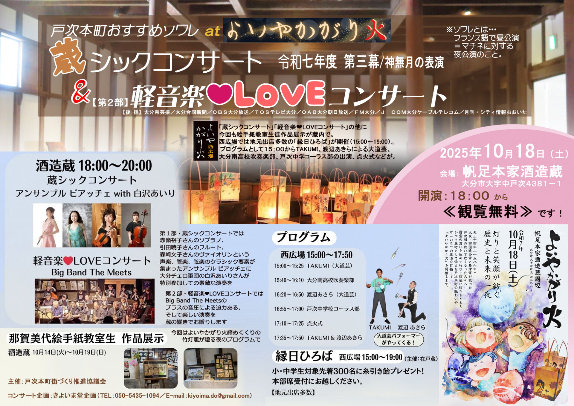 蔵ならではの響きで生演奏を楽しめる帆足本家酒造蔵での「蔵シックコンサート」。「戸次本町おすすめマチネ」として、昨年度に引き続き開催します。