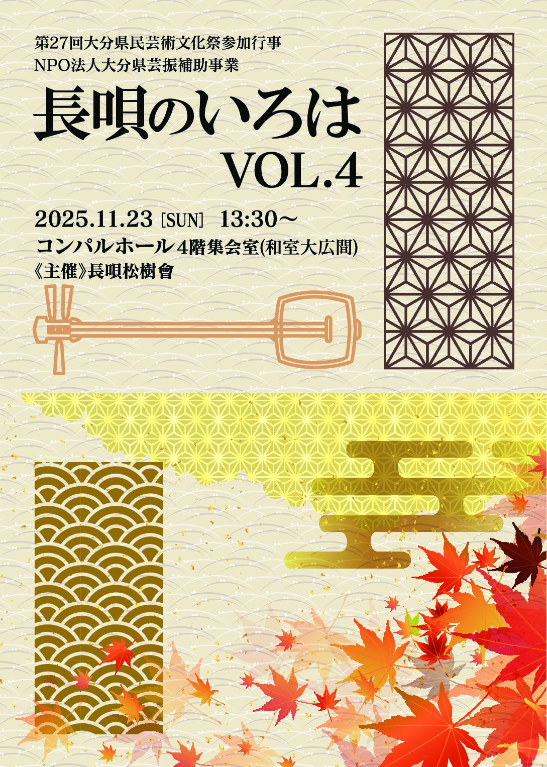 会主 芳村孝次女が曲の解説を交えながら、長唄(唄と三味線)を楽しんで頂くための会です。 秋の風情を感じながら、お客様にも一部分参加して頂きます。 ※子供用のお三味線もありますので、三歳以上であれば唄や三味線も実際に体験していただく事もできます。
